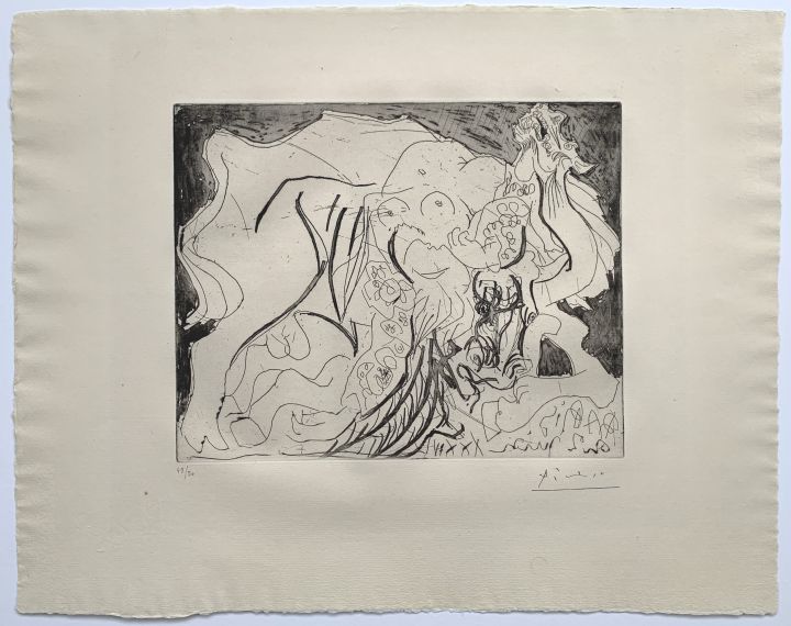 One of Picasso's rarest prints. Dedicated by the artist to Roger Lacourière, printer of the Suite Vollard. This is the only known proof of this state, although, judging from the inscription in the lower left, there seem to have been originally 4 proofs. There is one proof of the first state in the Museé Picasso, Paris (MP 2406).